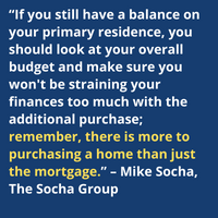 If you still have a balance on your primary residence, you should look at your overall budget and make sure you won't be straining your finances too much with the additional purchase; remember, there is more to purchasing a home than just the mortgage.