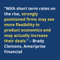 Firms with excess capital versus firms that are highly leveraged: Firms with large amounts of cash may use a down market as an opportunity to increase their market share. With short term rates on the rise, strongly positioned firms may see more flexibility in product economics and may actually increase their deals.