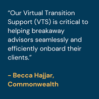 Our Virtual Transition Support (VTS) is critical to helping breakaway advisors seamlessly and efficiently onboard their clients. VTS collaborates with advisors and clients to gather necessary information, open client accounts, complete transfer paperwork and facilitate client signatures via e-signature.