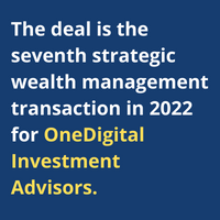 According to the press release, the deal is the seventh strategic wealth management transaction in 2022 for OneDigital Investment Advisors. The RIA is a subsidiary of the Atlanta-based insurance brokerage, financial services and HR consulting firm OneDigital, which serves over 100,000 employers. The RIA has AUM of approximately $108.1 billion, more than 1 million participants and 41,000 individual accounts.
