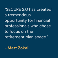 SECURE 2.0 has created a tremendous opportunity for financial professionals who focus on the retirement plan space. From enhanced tax credits that can be used to offset the cost of establishing new plans and employer contributions to requiring automatic enrollment and escalation, financial professionals see a significant increase not only in the number of business owners looking to establish plans, but also in the expected contributions within those plans.