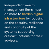 Additionally, independent wealth management firms must do more to harden digital infrastructure by focusing on the security, resilience and continuity of the systems supporting critical functions for their advisors. They also need a robust third-party risk management program that includes a thorough cyber review of all involved parties.