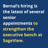 Bernal’s hiring is the latest of several senior appointments to strengthen the executive bench at SageView. This year, SageView hired Jim Dario as Head of Wealth Management and Tara Egan as Managing Director, Human Resources. In 2021, the firm hired Tony Notermann as CFO and Jeremy Holly as Chief Development and Integration Officer.