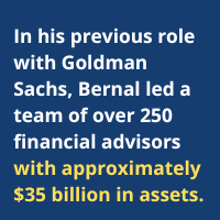 In his previous role with Goldman Sachs, Bernal led a team of over 250 financial advisors with approximately $35 billion in assets. Prior to that, Bernal served as COO at United Capital Financial Advisors, a Senior Vice President at Fidelity Investments, a Managing Director at JP Morgan Chase and Vice President of Customer Service & Sales at Citibank.