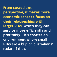 From the custodians’ perspective, it makes more economic sense to focus on their relationships with larger RIAs, which they can service more efficiently and profitably. This creates an environment where small RIAs are a blip on custodians’ radar, if that.