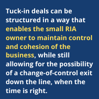 Tuck-ins can be structured in a way that enables the small RIA owner to maintain control and cohesion of the business, while still allowing for the possibility of a change-of-control exit down the line, when the time is right.