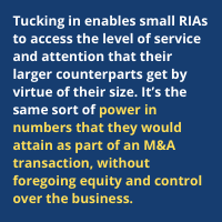 Tucking in enables small RIAs to access the level of service and attention that their larger counterparts get by virtue of their size. It’s the same sort of power in numbers that they would attain as part of an M&A transaction, without foregoing equity and control over the business.