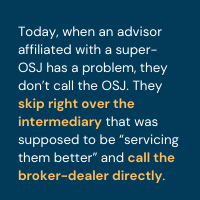 Today, when an advisor affiliated with a super-OSJ has a problem, they don’t call the OSJ. They skip right over the intermediary that was supposed to be “servicing them better” and call the broker-dealer directly. This negates the super-OSJ’s value proposition and can actually turn them into a liability for the broker-dealer, since they are taking AUM off-platform – AUM that the broker-dealer paid for by helping the super-OSJ recruit those advisors in the first place.