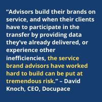 In Knoch’s perspective, “When all this comes together, clients and financial advisors get anxious about a move to a new firm or custodian. Advisors build their brands on service, and when their clients have to participate in the transfer by providing data they’ve already delivered, or experience other inefficiencies, the service brand advisors have worked hard to build can be put at tremendous risk.”