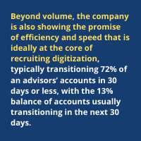 Beyond volume, the company is also showing the promise of efficiency and speed that is ideally at the core of recruiting digitization, typically transitioning 72% of an advisors’ accounts in 30 days or less, with the 13% balance of accounts usually transitioning in the next 30 days.