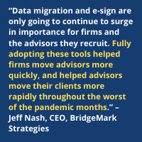 “They each deliver a crucial service, and they each have been under-utilized in the traditional recruiting process. Data migration and e-sign are only going to continue to surge in importance for firms and the advisors they recruit. Fully adopting these tools helped firms move advisors more quickly, and helped advisors move their clients more rapidly throughout the worst of the pandemic months.”