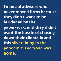 “Financial advisors who never moved firms because they didn’t want to be burdened by the paperwork, and they didn’t want the hassle of chasing down their clients found this silver lining in the pandemic: Everyone was home.”