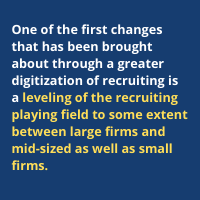 One of the first changes that has been brought about through a greater digitization of recruiting is a leveling of the recruiting playing field to some extent between large firms and mid-sized as well as small firms.