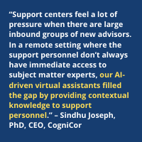 “Support centers feel a lot of pressure when there are large inbound groups of new advisors. In a remote setting where the support personnel don’t always have immediate access to subject matter experts, our AI-driven virtual assistants filled the gap by providing contextual knowledge to support personnel.”