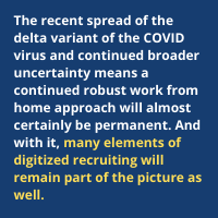 However, the recent spread of the delta variant of the COVID virus and continued broader uncertainty means a continued robust work from home approach will almost certainly be permanent. And with it, many elements of digitized recruiting will remain part of the picture as well.