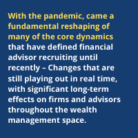 And then the pandemic happened. And with it, came a fundamental reshaping of many of the core dynamics that have defined recruiting until recently – Changes that are still playing out in real time, with significant long-term effects on firms and advisors throughout the wealth management space.