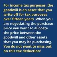 For income tax purposes, the goodwill is an asset that you write off for tax purposes over fifteen years. When you are negotiating the purchase price you want to allocate the price between the goodwill and other assets that you may be purchasing. You do not want to miss out on this tax deduction!