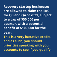 Recovery startup businesses are allowed to claim the ERC for Q3 and Q4 of 2021, subject to a cap of $50,000 per quarter, with a potential benefit of $100,000 for the year.