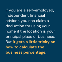 If you are a self-employed, independent financial advisor, you can claim a deduction for using your home if the location is your principal place of business.
