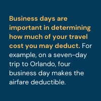 Business days are important in determining how much of your travel cost you may deduct. For example, on a seven-day trip to Orlando, four business day makes the airfare deductible.