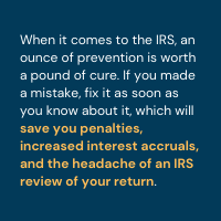 When it comes to the IRS, an ounce of prevention is worth a pound of cure. If you made a mistake, fix it as soon as you know about it, which will save you penalties, increased interest accruals, and the headache of an IRS review of your return.