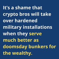 It’s a shame that crypto bros will take over a hardened military installation when they serve much better as doomsday bunkers for the wealthy, who will no doubt be able to reach the Great Plains in their private jets before zombies and asteroids destroy the airports in the Hamptons.