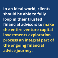 In an ideal world, clients should be able to fully loop in their trusted financial advisors to make the entire venture capital investments exploration process an integral part of the ongoing financial advice journey.