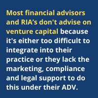 But here’s the reality: Most financial advisors and RIA’s don't advise on venture capital because it's either too difficult to integrate into their practice or they lack the marketing, compliance and legal support to do this under their ADV.