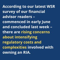 According to our latest WSR survey of our financial advisor readers – commenced in early June and concluded last week – there are rising concerns about intensifying regulatory costs and complexities involved with owning an RIA.