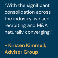“With the significant consolidation across the industry, we see recruiting and M&A naturally converging,” says Kimmell. She points out that advisors and firms are seeking the benefits of scale.