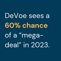 “It is a matter of time before ‘consolidators start consolidating,’” says DeVoe, noting that a small group of extremely large firms are creating consolidation at the top. His firm sees a 60% chance of a “mega-deal” in 2023.