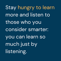 Stay curious and LISTEN. I thrive on not being the smartest person in the room. If you are, you are not with the right company. Stay hungry to learn more and listen to those you consider smarter: you can learn so much just by listening.