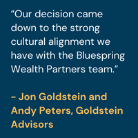 “Our decision came down to the strong cultural alignment we have with the Bluespring Wealth Partners team. We’re a client-first firm with a team-oriented, growth-minded approach,” Goldstein and Peters said in the press release. “Bluespring Wealth Partners checked all our boxes, allowing us to keep our brand, identity in the local community, and processes that work for our team and clients while providing support to achieve our long-term goals.”