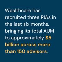 Why it matters: Wealthcare utilizes the proprietary GDX360 fiduciary process to integrate planning, investing, trading and a suite of practice management services. The company also is a recent winner of the WSR Wealth Exemplar Awards Practice Management Platform of the Year. Wealthcare – which comprises two RIAs, Wealthcare Advisory Partners and Wealthcare Capital Management – is backed by the private equity firm NewSpring Holdings.
