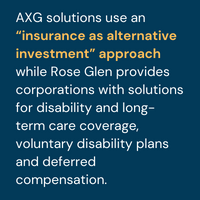 Why it matters: AXG solutions use an “insurance as alternative investment” approach while Rose Glen provides corporations with solutions for disability and long-term care coverage, voluntary disability plans and deferred compensation.