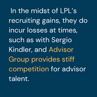 Why it matters: In the midst of LPL’s recruiting gains, they do incur losses at times, such as with Sergio Kindler, and Advisor Group provides stiff competition for advisor talent. For local moves like Kindler, Advisor Group offers office space with support staff and an independent but corporate atmosphere, which could be an overlooked advantage in the recruitment race.