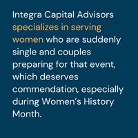 Among its other service areas, Integra Capital Advisors specializes in serving women who are suddenly single and couples preparing for that event, which deserves commendation, especially during Women’s History Month.