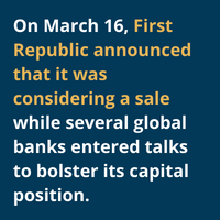 Why it matters: In the aftermath of the rapid-fire failures of the regional Silicon Valley Bank and Signature Bank in the U.S. and the bailout of much larger global bank Credit Suisse by the Swiss National Bank, First Republic Bank experienced massive deposit outflows, an 82% drop in its stock price and saw ratings agencies downgrade its credit to junk. On March 16, First Republic announced that it was considering a sale while several global banks entered talks to bolster its capital position.