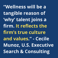 Munoz believes that employee wellness will shift from a competitive recruiting edge to a must-have. She says, “Wellness will be a tangible reason of ‘why’ talent joins a firm. It reflects the firm’s true culture and values.”