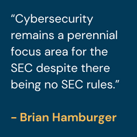 Cybersecurity remains a perennial focus area for the SEC despite there being no SEC rules. The SEC recently confirmed it will focus on firms’ policies and procedures, governance practices, responses to cyber-related incidents, including those related to ransomware attacks, and RIAs’ compliance with Regulations S-P and S-ID, where applicable.