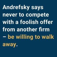 Recently, Andrefsky secured a significant credit facility to drive M&A growth and oversaw the implementation of GAAP reporting for Stratos. She believes that firms must develop a structure that enables growth without allowing expenses to spiral prior engaging in meaningful M&A activity. She says never to compete with a foolish offer from another firm – be willing to walk away.