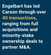 During his time as CFO, Engelbart led Carson through over 40 transactions, ranging from full acquisitions and minority-stake ownership deals to partner M&A, and played a key role in the buildout of Carson’s headquarters. Under his leadership, the firm has grown to $21 billion in assets under management with 45,000 client families.