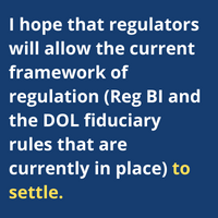 Ho: Our goal should always be to protect investors and ensure that they have access to the advice and services they need to achieve their financial goals. Going back to the fiduciary debate, I hope that regulators will allow the current framework of regulation (Reg BI and the DOL fiduciary rules that are currently in place) to settle.