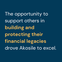 Akosile strives to provide a holistic approach to her clients, including risk management, insurance needs, retirement planning, estate planning, cash flow management, investments, education planning and generating funding for special purposes.