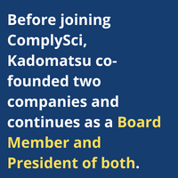 Before joining ComplySci, Kadomatsu co-founded two companies – technology consultancy Roko Labs and business chatbot provider Instabot – and continues as a board member and president of both.