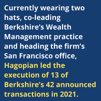 Currently wearing two hats – co-leading Berkshire’s Wealth Management practice and heading the firm’s San Francisco office – she led the execution of 13 of Berkshire’s 42 announced transactions in 2021.