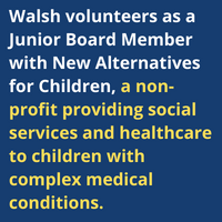 Outside the office, Walsh volunteers with Project Purple, a non-profit supporting families and funding research for pancreatic cancer, and New Alternatives for Children, a non-profit providing social services and healthcare to children with complex medical conditions.